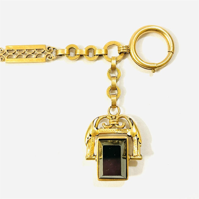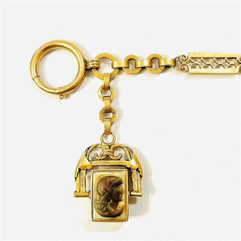 Masivní, elegantní řetízek k hodinkám/šatlén s členitými historizujícími články, připojen ověsek s otočným medailonem osazeným přírodním hematitem obdélného plochého brusu a kamejí z řezané přírodní bílo-hnědé perleti s podobiznou antického vojáka. Tradičně pojatý pánský dekorativní šperk, solidní vídeňská zlatnická práce ze 70. až 80. let 19. století. Zhotoveno z narůžovělého žlutého 14 karátového zlata, tj. o ryzosti 580/1000; rakousko-uherský punc Z-27 (liška 4) s písmenem "A" (značící vídeňský puncovní úřad) na několika místech. Hmotnost 28,83 g, délka 33,5 cm, ověsek s řetízkovinou 5,5 cm, šířka vazby 8 mm, ověsek 23 mm. Zapínání formou karabinky a pérového kroužku v pořádku, stopy nošení, jinak celkově v dobrém stavu.
