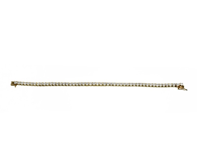 Tenisový náramek ze žlutého zlata s brilianty o celkové hmotnosti 5 ct (čistota Si3, barva G). Au 750/1000, hmotnost 13,20g. Čechy, 2. polovina 20. století. Délka: 18 cm, šířka: 0,3 cm.