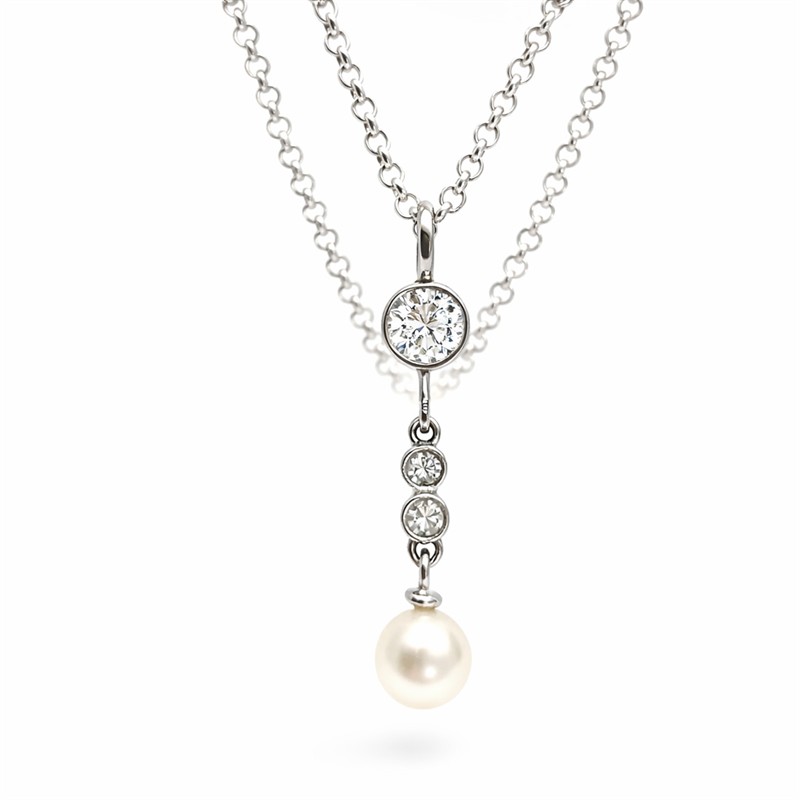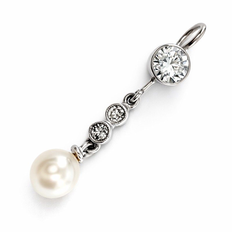Půvabný závěs z bílého zlata o ryzsoti 14karátů (585/1000). Šperk do cargle zasazený briliant o váze cca 0,35 ct. Kinetický ověs zdobí dva drobnější brilianty a sněhobílá perla o průměru 5 mm. Celková váha 1,24 g. Délka 2,7 cm. Perfektní stav. Řetízek není součástí prodeje.