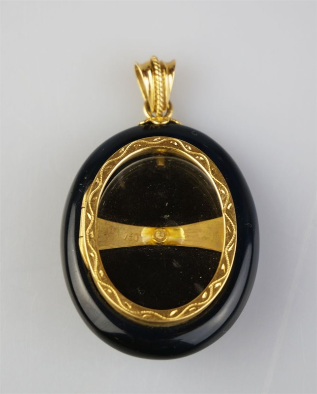 zlatý závěs s broušeným masivním onyxem a diamantovou routou, zadní strana se schránkou se sklíčkem, Au btto 20,91 g/750/1000, západní Evropa, kolem r. 1890, atest Puncovního úřadu; rozměr 5,3 x 3,2 cm