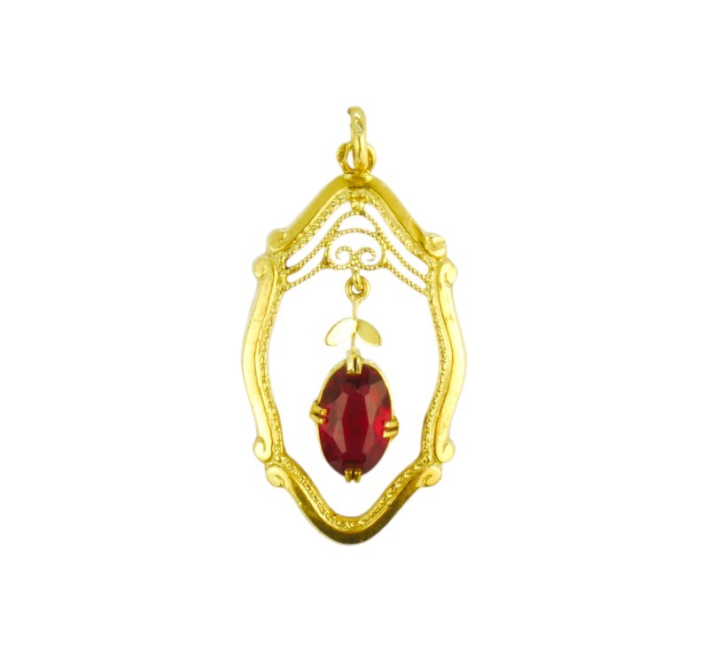 Secesní závěs ze žlutého zlata ryzosti 585/1000 zdobí červený spinel, rozměry 3 x 1,5 cm, hmotnost 1,21 g.