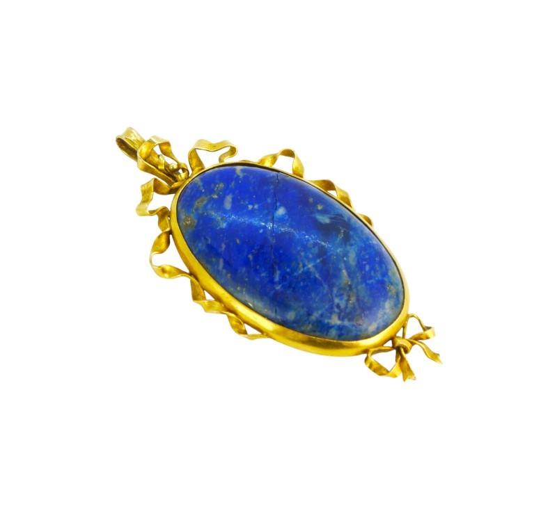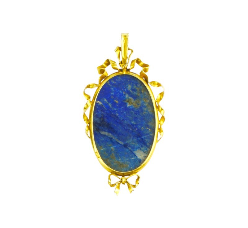 Závěs zhotovený ze žlutého zlata ryzosti 585/1000 osazený velkým lapisem lazuli - ve středu diagonální prasklina. Rozměr 4,2 x 2,2 cm. Celková hmotnost 4,81 g.