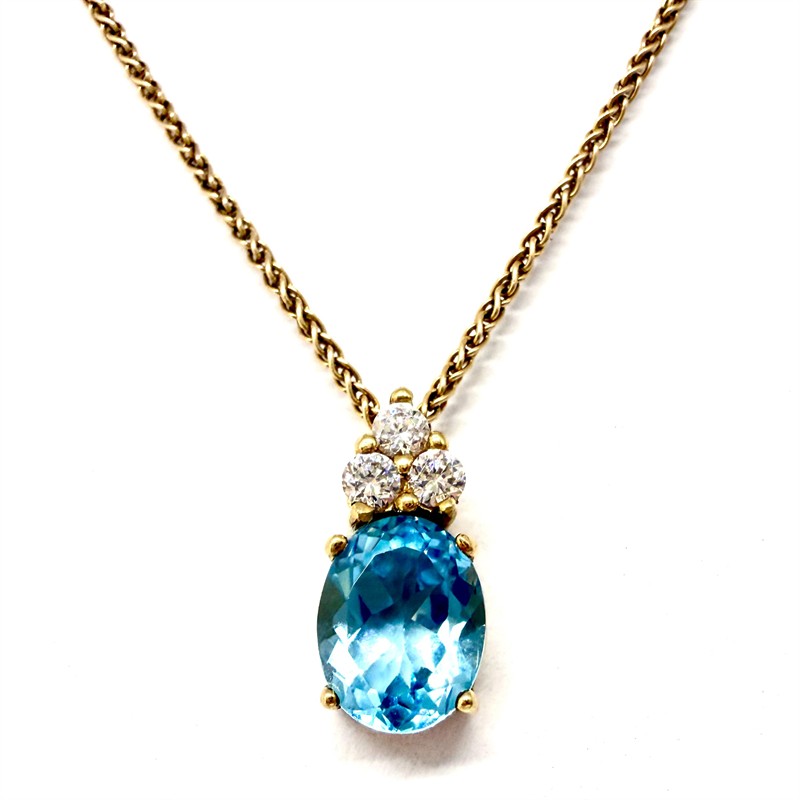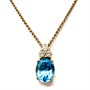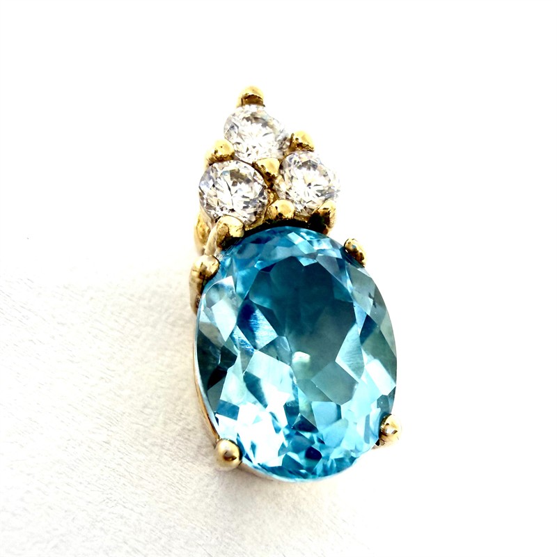 Půvabný, zlatý závěs zdobený topazem výrazného tyrkysovo-azurového odstínu. Drahý kámen je přírodního původu, jeho výrazného, nevšedního odstínu bylo dosaženo zahřátím. Topaz je kontrastně dozdoben bílými, transparentními kameny diamantového brusu s vysokou brilancí. Závěs byl zhotoven ze zlata ryzosti 333/1000, o celkové váze 1,68 g. Rozměry 1,4 x 0,7 cm. Profesionálně vyčištěno, perfektní stav. Řetízek není součást prodeje.