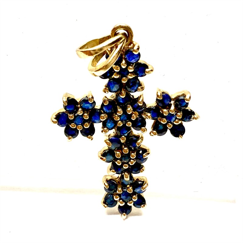 Velmi půvabný zlatý závěs, zdobený přírodními modrými safíry. Drahokamy byly sestaveny do šesti jemných květů, jež dohromady tvoří celek kříže. Zlato ryzosti 333/1000, celková váha 1,47 g. Rozměry 2,8 x 1,5 cm. Něžný, půvabný, příjemně nositelný šperk v perfektním stavu.
