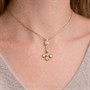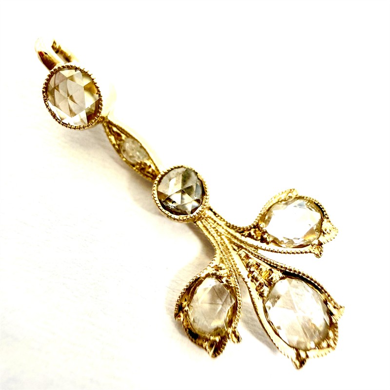 Půvabný, něžný závěs ze 14ti karátového zlata (585/1000) nesoucí nevšední florální motiv. Šperk zdobí pět velkých a jedna drobná diamantová routa. Váha šperku 1,23 g. Délka 2,5 cm. Závěs byl profesionálně vyleštěn a je ve výborném stavu. Řetízek není součástí prodeje.