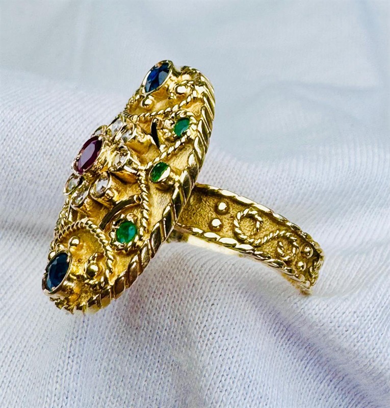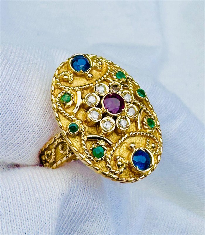 18K ZLATÝ PRSTEN S PŘÍRODNÍM DRAHOKAMY A DIAMANTY V ETUI - 7,3 GRAMŮ, prsten je vyrobený z 18K zlata a váží 7,3 gramů. Přírodní rubín, safíry, smaragdy a diamanty o celkové váze 0,87 ct.. Prsten má velikost 53. Součástí prstenu je dobová etue.