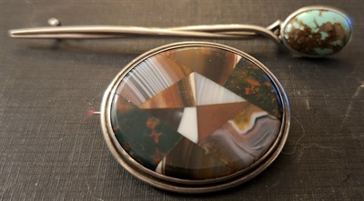 - oválná brož s centrální mozaikou z barevnými achátů (rozměr brože 40 x 32 mm, celková hmotnost 12g, stříbro, puncováno, ryzost 800/1000 30. leta m.s, originální, turnovská autorská práce, výborná zachovalost - dlouhá brož s tyrkysem 8,8 x 1,2 cm, hmotnost 6 g, stříbro nově puncováno 900/1000, autorská práce, výborná zachovalost,