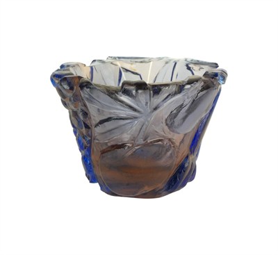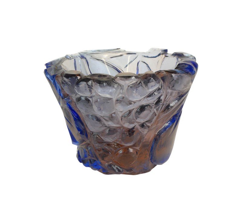 Sklo čiré, přejímané sklem fialové (modrooranžové) s řezaným dekorem ovoce, broušeno, výška 12,5 cm, horní průměr 17,9 cm. Práce z druhé poloviny 40. let. Z brusičské Školy v Kamenickém Šenově. Váza signována Drobník.