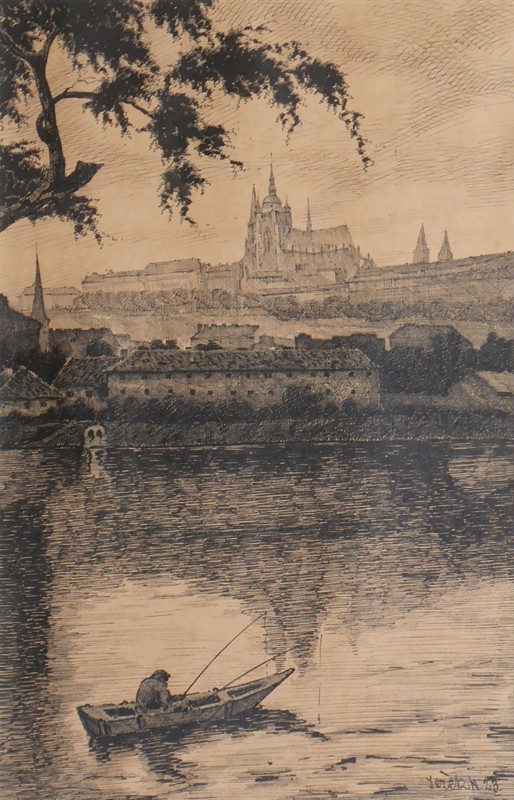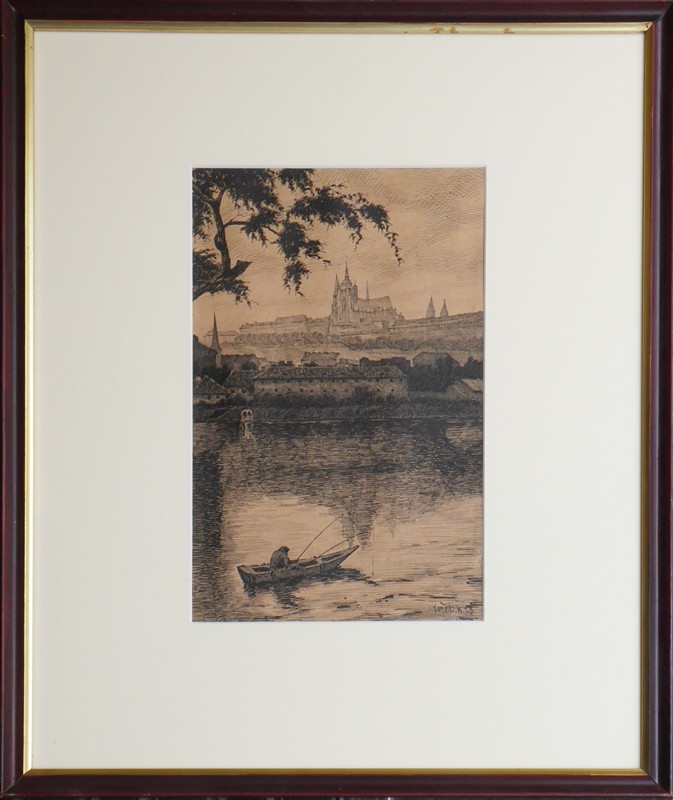 Kresba tuší na papíru 25,5 cm x 15,5 cm. Signováno vpravo dole s datací 1923. Idylická scenérie jednoho chladného rána na Vltavě se schouleným rybářem s prutem v ruce chytajícím ryby pod panoramatem Hradčan. V dřevěném hnědě mořeném úzkém rámu s vnitřní zlatou lištou, s paspartou a sklem. Československo, rok 1923. Celkový rozměr s rámem 44 cm x 36 cm.