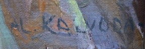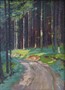 Olej na kartonu 47 cm x 33 cm. Signováno vpravo dole. Autor: Alois Kalvoda (1875-1934) český malíř, krajinář, jeden z nejvýznamnějších žáků profesora Julia Mařáka. Impresionistická nálada s paprsky slunečního svitu prosvěcující zákrutu lesní cesty mezi kmeny stromů. V klenutém širokém odstupňovaném rámu s horní ručně řezanou lištou zdobenou plátkovým zlatem. Čechy 1910 - 1920. Celkový rozměr s rámem 56,5 cm x 42,5 cm.