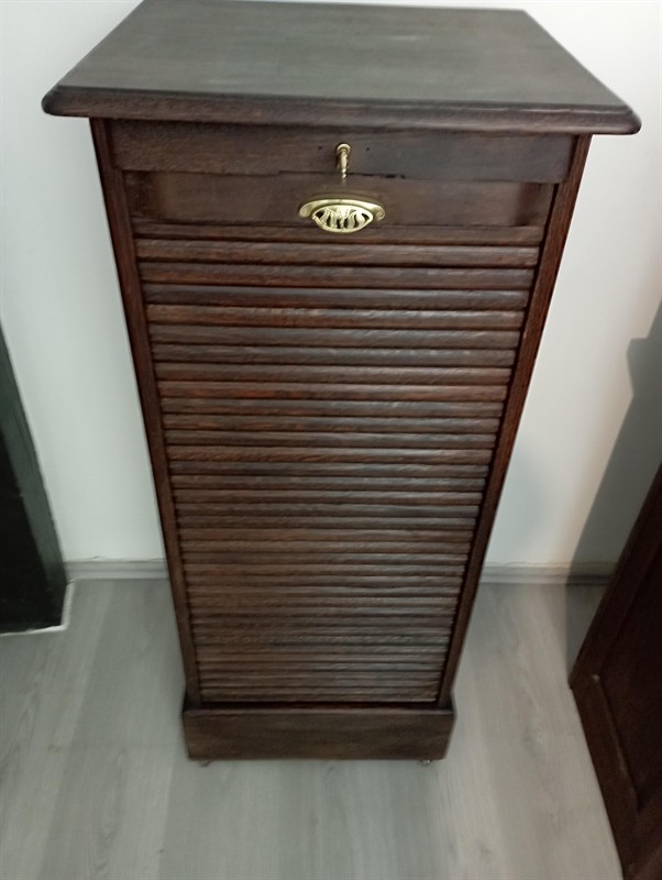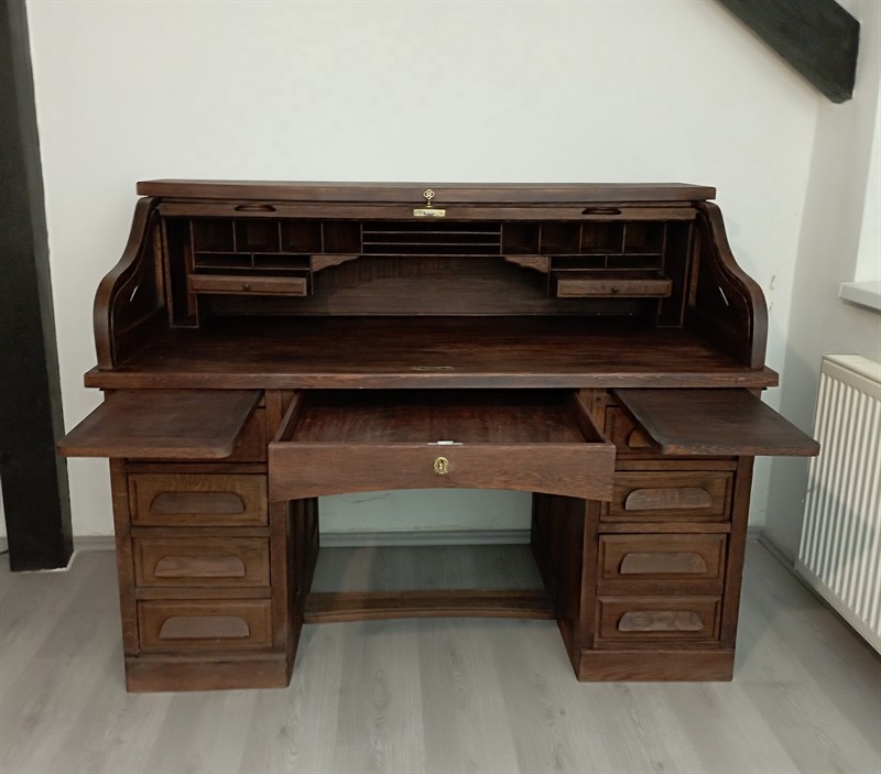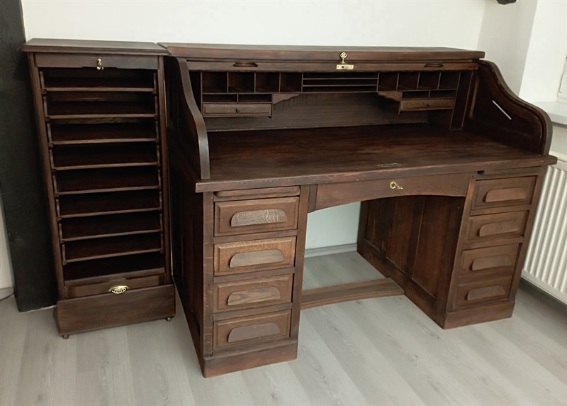 Americký psací stůl s roletou z meziválečného období, rozměry šířka 151 cm, hloubka 84 cm, výška pracovní desky 79 cm výška horní desky 117 cm. stůl by kompletně rozebrán a opět kus po kuse složen, slepen, přebroušen, namořen a navoskován. Lamely rolety byly podlepeny novým pevným plátnem, zámky byly restaurovány a byly k nim vyrobeny nové designové mosazné klíče. Stůl má vestavěno automatické zamykání zásuvek při zatažené roletě, má také dvě skryté zásuvky. Všechny části jsou plně funkční. Nedílnou součástí stolu je také zásuvková skříňka s 8 zásuvkovými vložkami a s roletou velmi podobného designu a stejné výšky. Její rozměry jsou šířka 50 cm, hloubka 45 cm, výška 117 cm. Tato je také po kompletním náročném restaurování včetně zámku a klíče, zásuvkových vložek a nově podlepené rolety. Jedná se o výjimečnou soupravu, která je v tomto technickém stavu a konfiguraci nesehnatelná. Cena je za oba kusy.