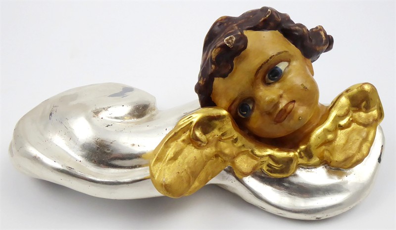 Dřevořezba, polychromie, zlacení, stříbření. Přiloženo osvědčení Národního památkového ústavu České republiky. Dřevořezba hlavy anděla s kadeřavými hnědými vlasy na stříbrném oblaku. Andílek má hlavu skloněnou na levou stranu s obličejem s výraznýma modrýma očima a karmínovými rty. Krček anděla přechází ve stylizovaná zlacená rozevřená křídla. Zadní strana dřevořezby plochá. Střední Evropa, 19. století. Výška 34 cm.