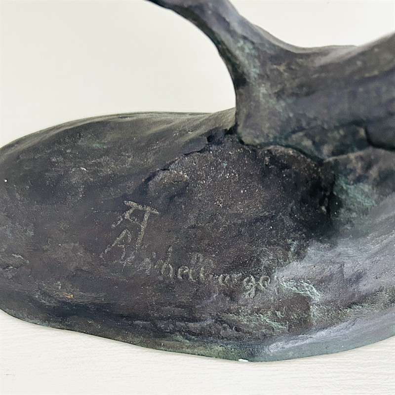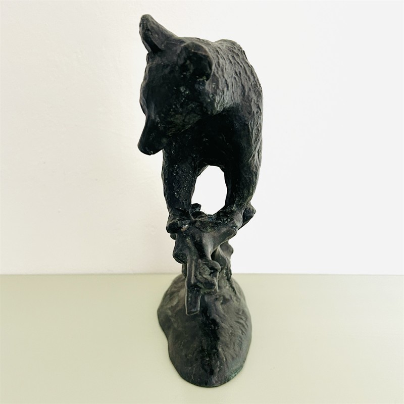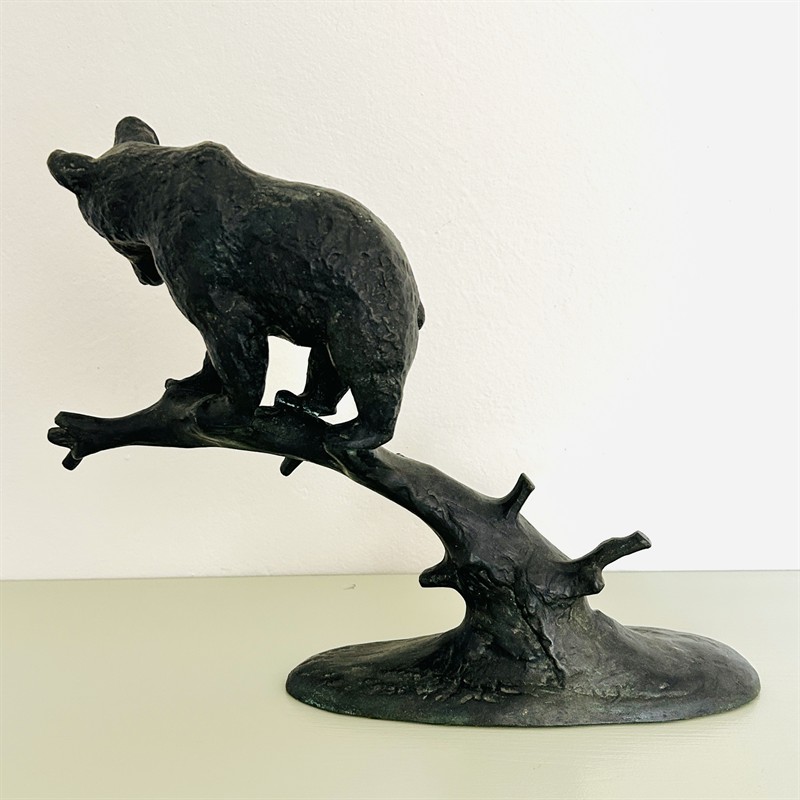 Stolní socha s motivem medvědího mláděte na větvi. Realistické zpodobnění s důrazem na měkkou modelaci blízkou hliněné plastice. Originální konstrukcí zaujme svým výrazným zásahem nad rámec podstavce do prostoru, čímž je divák konfrontován napětím z nestability. Dekorativní socha s oblíbenou lesní tematikou. Anton Büschelberger (1869-1934), německý sochař, studium na mnichovské Akademii. Ve své tvorbě se intenzivně věnoval zvířecím motivů, finálně provedených v bronzu či porcelánu (fabrika Karla Ense). Socha je datována do počátku 20. století a koresponduje s dalšími plastikami medvědů na větvi, jež pochází ze stejného tvůrčího období, které je rámováno umělcovým přesídlení do Drážďan. Bronz tmavě patinovaný. Signováno frontálně na podstavci „A. Büschelberger“. Výška 26,5 cm, délka 34 cm, šířka 10 cm. V zachovalém stavu.