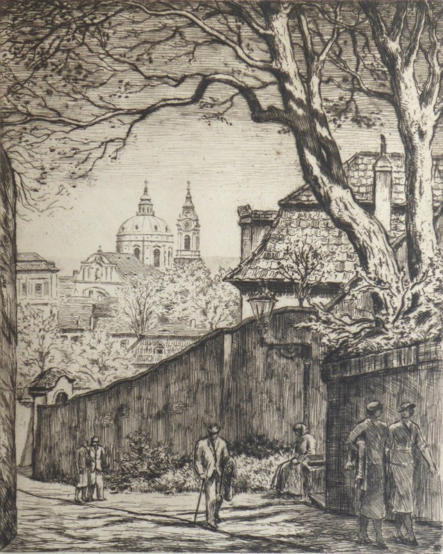 Lept na papíru 317 mm x 245 mm. Signováno vpravo dole tužkou a vpravo dole monogramem v tisku. Vlevo dole tužkou St. Nicholas Church, Prague. Výhled na věže Chrámu svatého Mikuláše z Nových zámeckých schodů. Originální zlatý rám s paspartou a sklem. Československo, Praha, 30. až 40. léta minulého století. Celkový rozměr s rámem 524 mm x 405 mm.