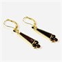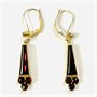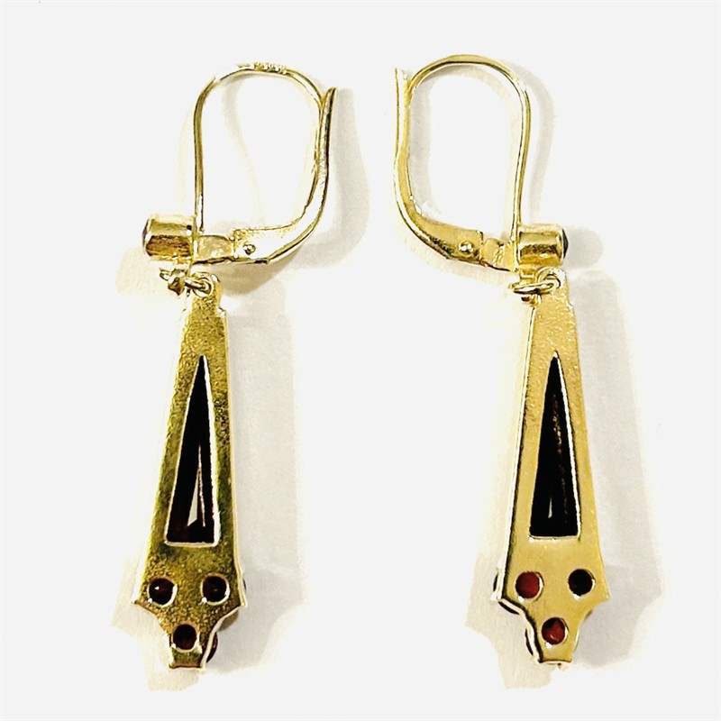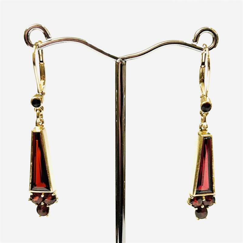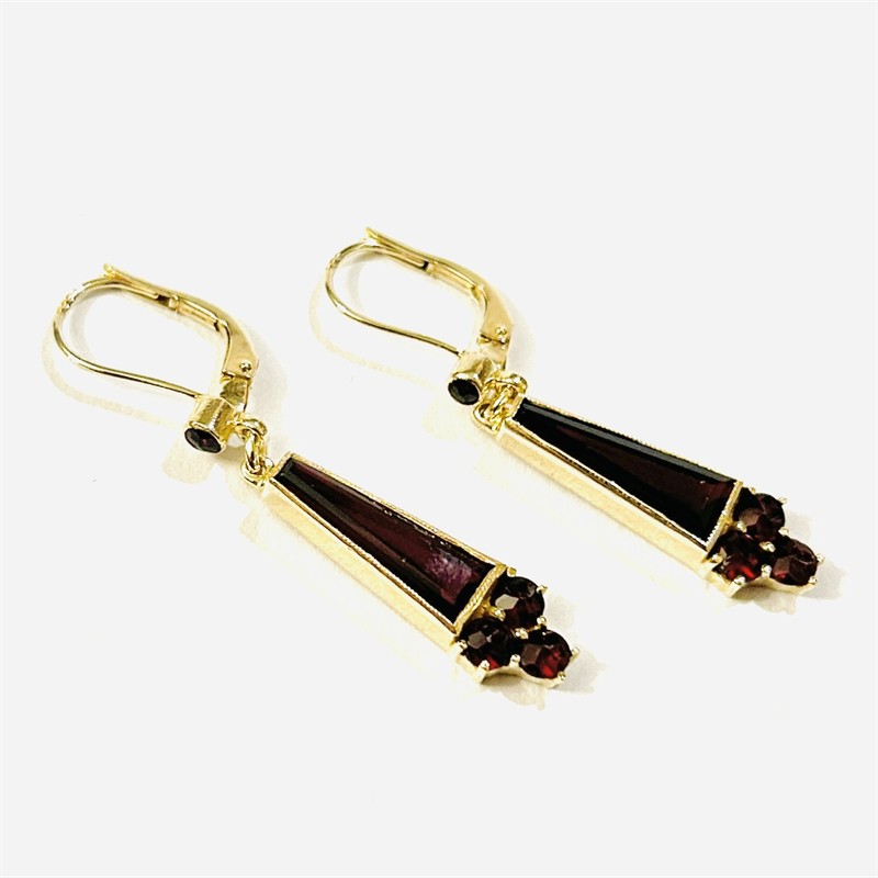 Velice elegantní visací náušnice z období art-deco, ověsky osazeny přírodními granáty a almandiny atypického podlouhlého lichoběžného a kulatého hvězdicového brusu, fasováno zrnitými obrubami a zrnkovou technikou. Nevšední, nadčasový design, kvalitní německá zlatnická práce z 30. let 20. století. Zapínání zhotoveno z 8 karátového zlata, tj. o ryzosti 333/1000, ověsky z obecného kovu; ryzostní číslo na dřících, značka výrobce u zapínání. Hmotnost 3,89 g, celková délka 42,5 mm, šířka 7,5 mm. Klapkové zapínání v pořádku, nově pozlaceno, celkově v zachovalém stavu.