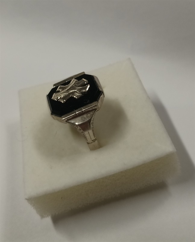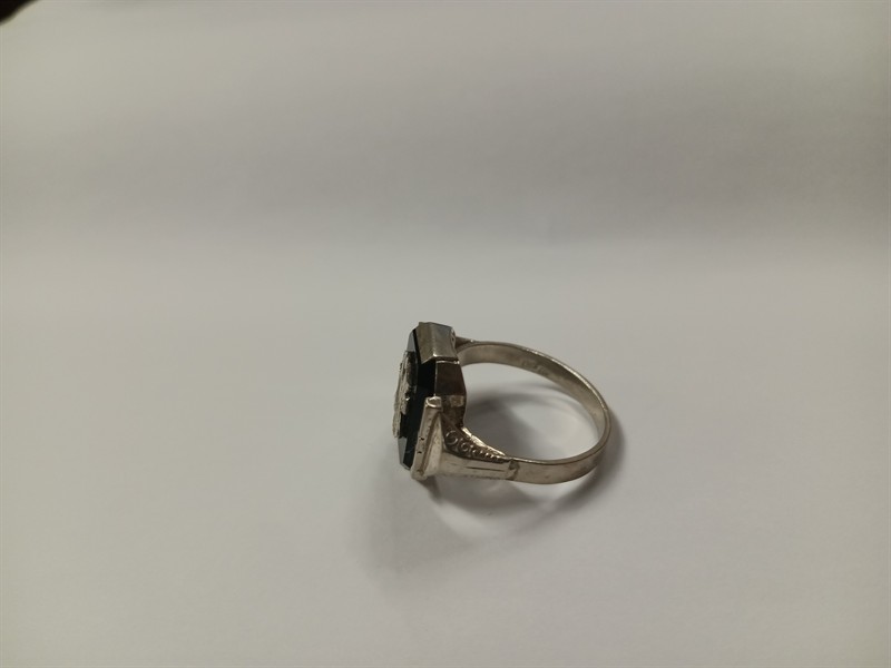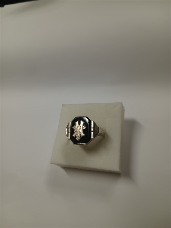 Pánský prsten z období art deco, stříbro ryzosti 9001000.Onyx s gravírovaným monogramem M V . Velikost prstenu 65 . Celková hmotnost 5,6 gr.