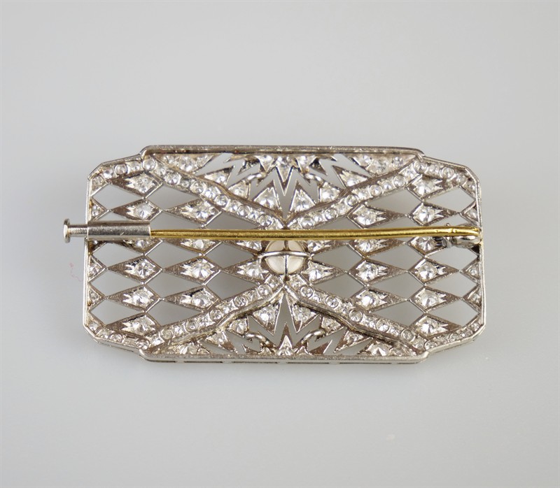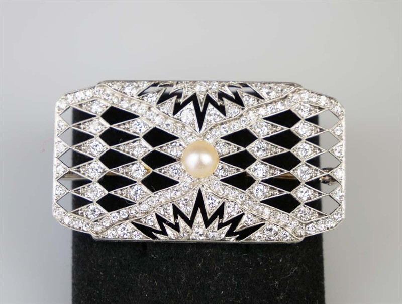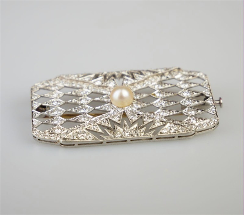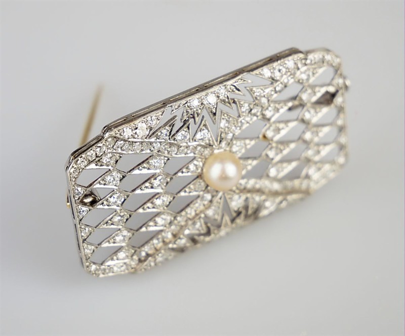 art deco platinová brož s 98 diamanty briliantového brusu velmi dobré kvality o celkové hmotnosti cca 2,15 ct a 1 kultivovanou perlou o průměru 6 mm, Pt+Au 12,88 g/950+750/1000 (zlatá jehla); střední Evropa, kolem r. 1930; rozměry 4,8 x 2,7 cm; atest puncovního úřadu, znalecký posudek