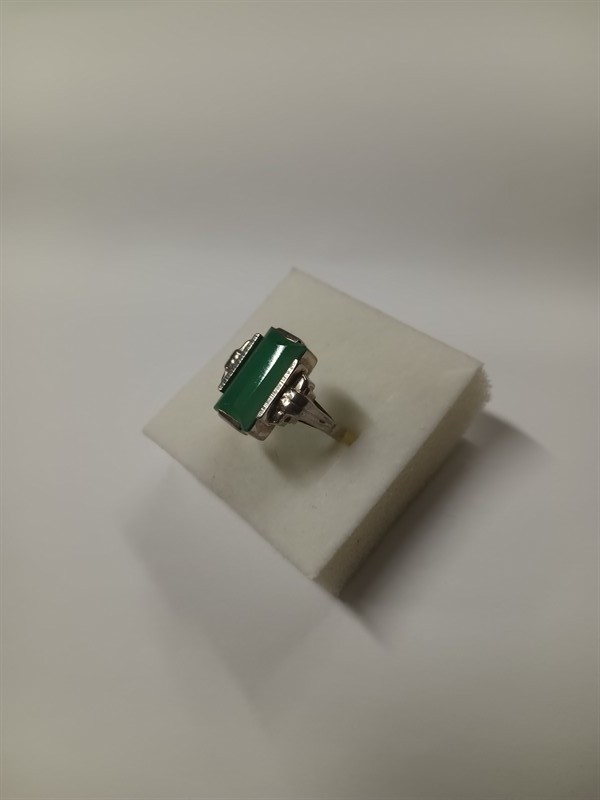 Art deco prsten vyrobený ze stříbra ryzosti 835/1000, s centrálním zeleným kamenem . Velikost prstenu je 57 . Hmotnost 3,9 gr.