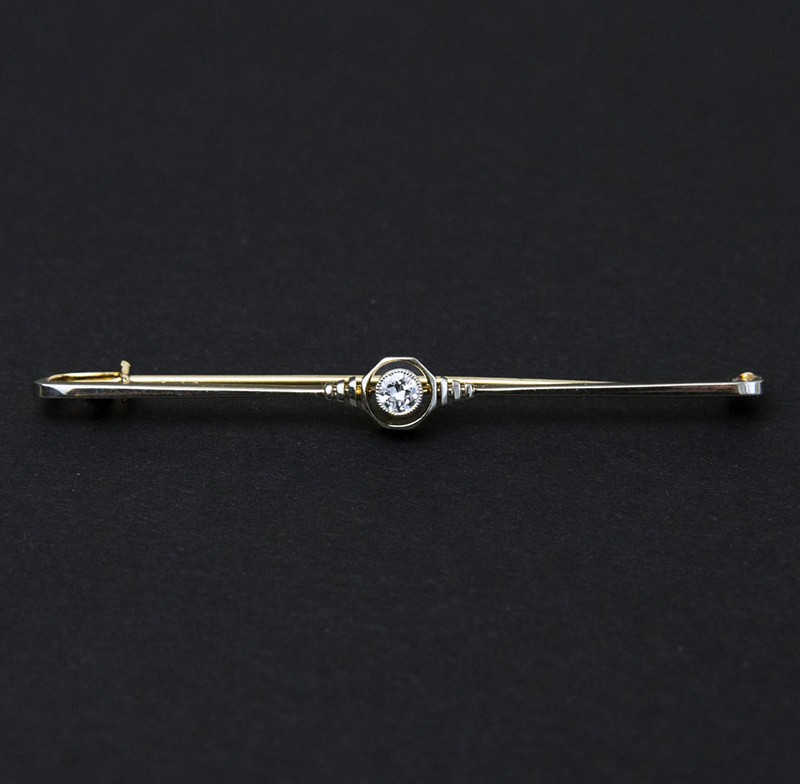 art deco zlatá brož s diamantem, elegantní symetrická brož s osmihranem, diamant starého briliantového brusu má hmotnost cca 0,1 ct, kvalita Si, barva I, 2,56 g/585/1000, Československo, punc, kolem r. 1925, délka 5,5 cm