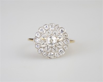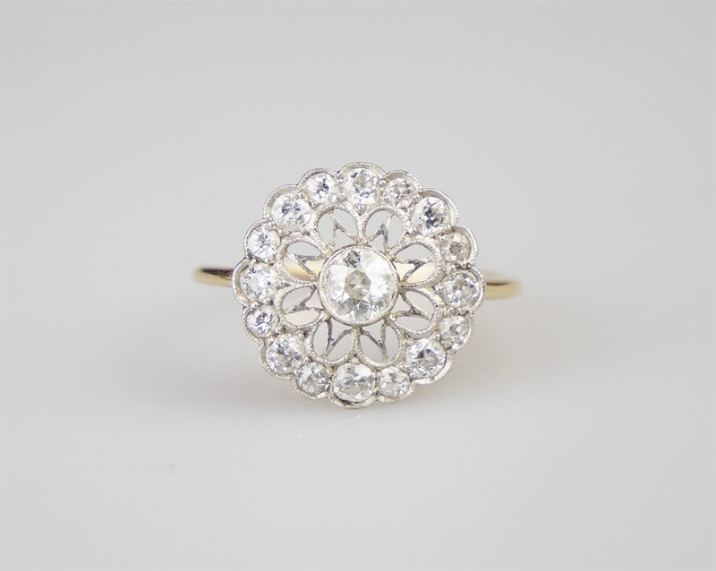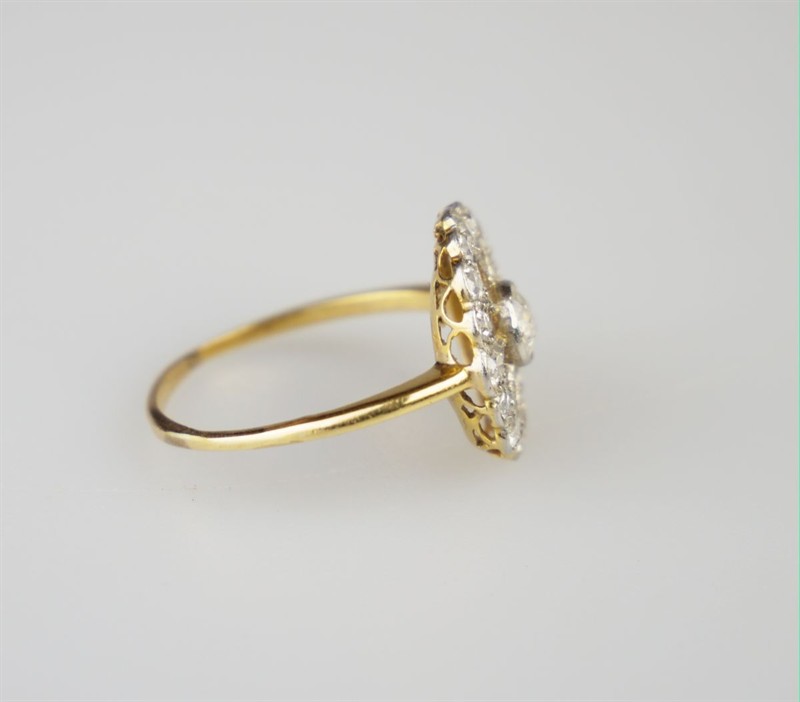 art deco zlatý prsten se 17 diamanty briliantového brusu o hmotnosti cca 1,2 ct, z toho centrální diamant o hmotnosti cca 0,35 ct, kameny v krajkově řešené hlavě zasazené v platině, Au+Pt btto 3,03 g/720+950/1000, západní Evropa, kolem r. 1935; atest Puncovního úřadu; velikost prstenu 59