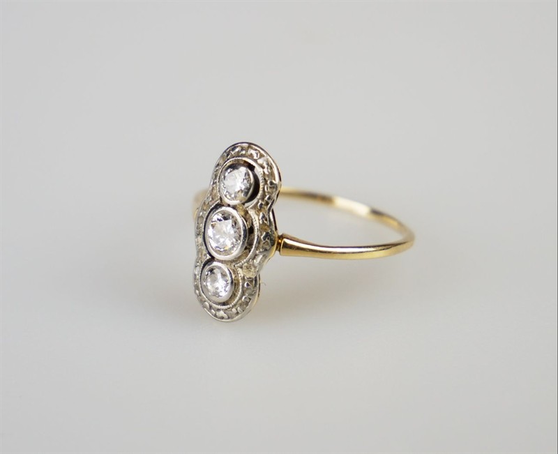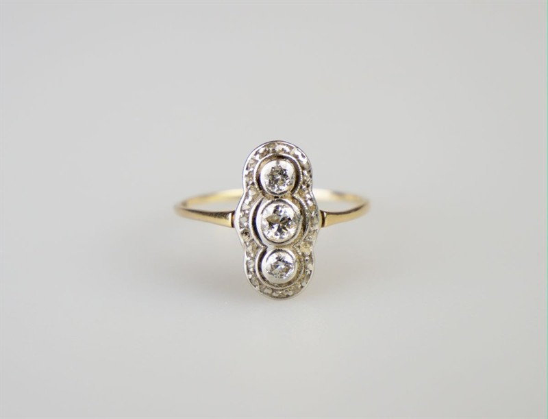 art deco zlatý prsten se třemi diamanty briliantového brusu o celkové hmotnosti cca 0,29 ct, kameny vsazené v platině, Au+Pt 1,30 g/540+950/1000, střední Evropa, kolem r. 1935, rozměry hlavy 0,7 x1,4 cm; atest Puncovního úřadu; velikost prstenu 50