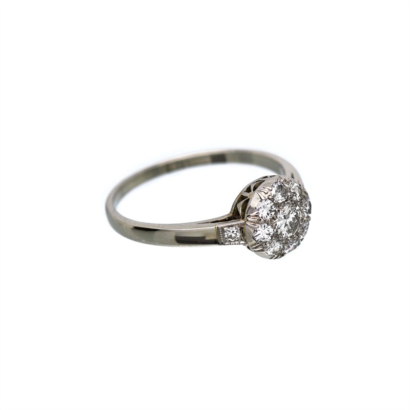 14 karátové bílé zlato 585/1000, celková hmotnost 2,46 g | Přírodní diamanty briliantového brusu celkem 0,46 ct | Období Art deco | Krásná práce | Výborný stav | Velikost prstenu 56 (lze upravit) | PŘILOŽEN CERTIFIKÁT PRAVOSTI