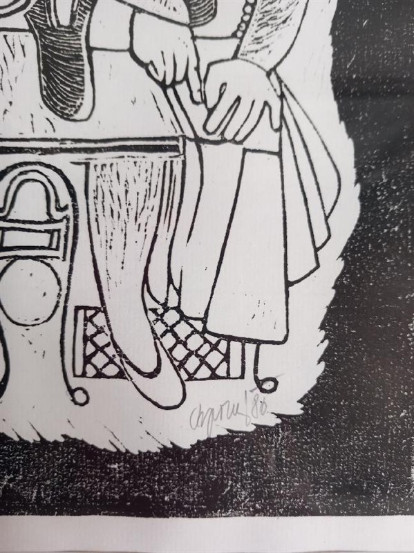 Babka s šicím stojem je originální grafika podepsaná vpravo dole tužkou Syrový a datovaná rokem 1986. Obrázek měří včetně rámu 40 x 30 cm a vlastní tisková plocha grafiky měří 24 x 16 cm.
