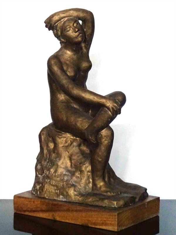 terakotová plastika s metalickou patinou, signováno Lad. Beneš, 2. VII, 49 KARTOUZY s přípiskem TOUHA, , výška bez soklu 30 cm, drobné oděrky