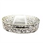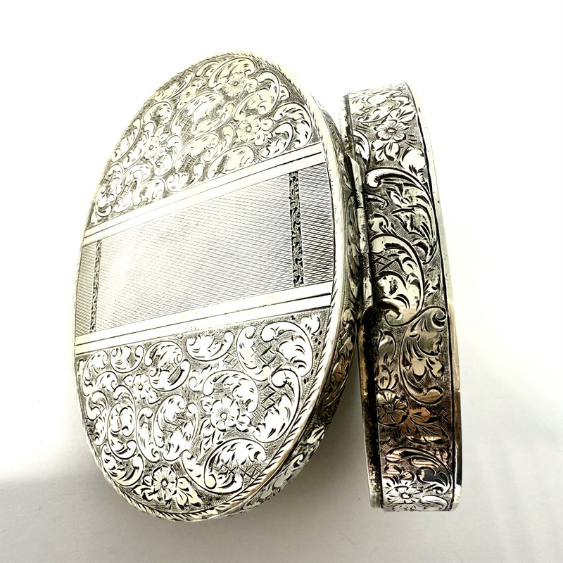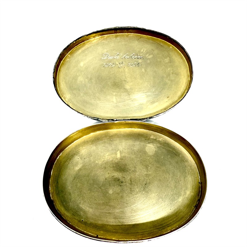 Elegantní, oválná krabička z první republiky. Artefakt byl zhotoven z masivního stříbra ryzosti 900/1000 a zdobí jej mistrné, hluboké rytí s florálním motivem. Střed je kontrastně zdoben pruhem s gilošováním. Značeno ryzostní, mistrovskou a původní puncovní značkou. Váha 90,90 g. Rozměry cca 8,5 x 6 cm. Uvnitř decentně pozlaceno. Na víčku nápis "Drahé babičce". Perfektní stav.