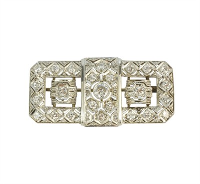 Oslnivá art deco brož ze zlata ryzosti 585/1000 celá osázená diamanty briliantového brusu celkové hmotnosti cca2 ct. Celková hmotnost brože je 7,58 g. Rozměry brože jsou 4,5 x 2,2 cm.