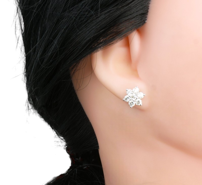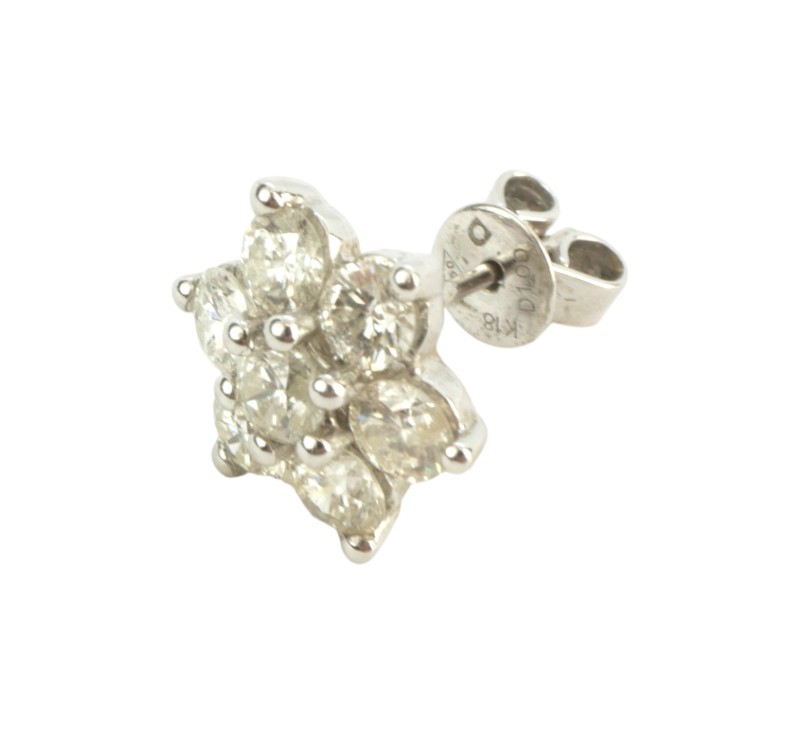 Náušnice z bílého zlata ryzosti 585/1000 zdobené zářivými brilianty celkové hmotnosti 1,20 ct (krásná barva G, čistota SI). Celková hmotnost náušnic: 3,19 g. Průměr: 1,2 cm.