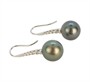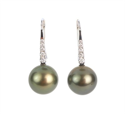 Elegantní zlaté visací náušnice s přírodními diamanty briliantového brusu 0,16 ct dobré barvy a čistoty a s tmavě šedými tahitskými perlami s krásným leskem. Zlato o ryzosti 18 karátů 750/1000 o celkové hmotnosti 6,68 g. Délka náušnic cca 3 cm, průměr perly 12 mm. Atest Puncovního úřadu.