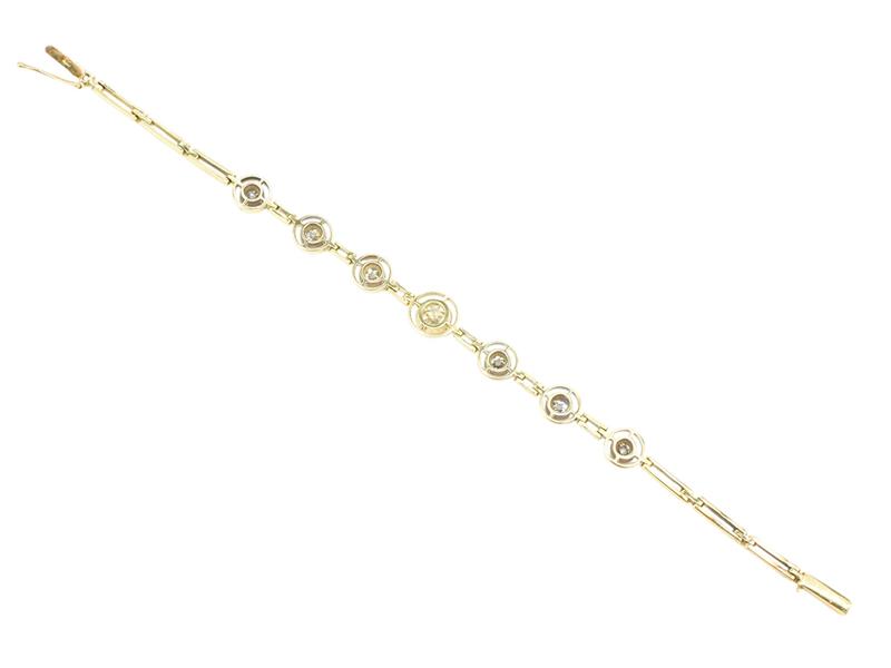 Luxusní článkový náramek ze žlutého zlata o ryzosti 585/1000 zdobený diamanty o celkové hmotnosti cca 2 ct, středový kámen má hmotnost 0,75 ct. Délka náramku 18 cm, celková hmotnost 14,70 g.
