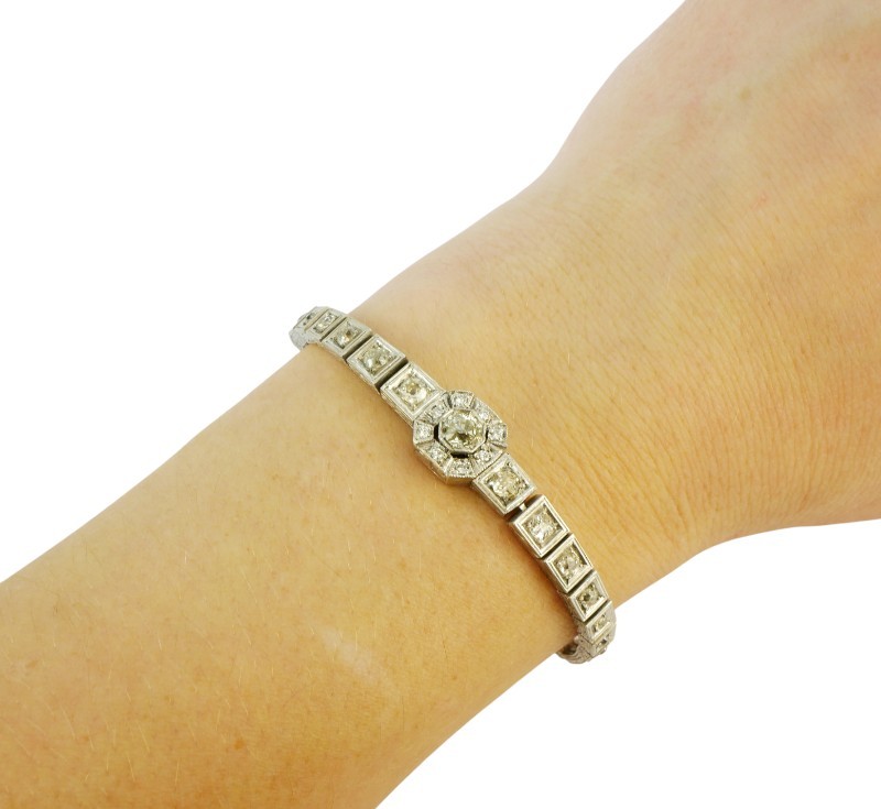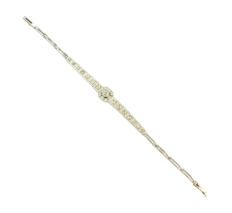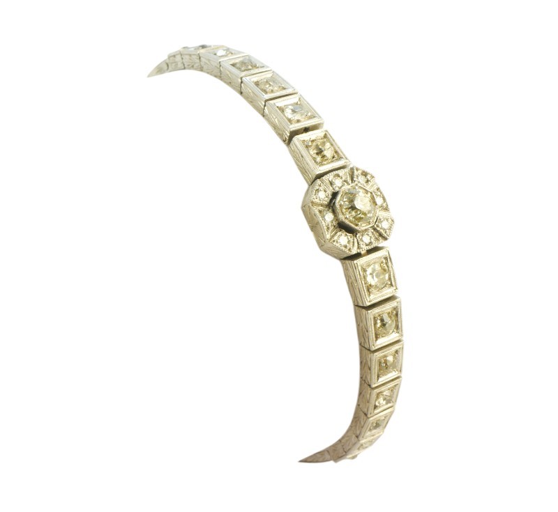 Luxusní briliantový náramek z počátku 20. století byl zhotoven v kombinaci bílého zlata ryzosti 230/1000 (4,20 g) a stříbra 900/1000 (8,46 g). Geometricky tvarované články s výraznějším centrálním středem jsou osazeny brilianty celkové hmotnosti cca 1 ct. Celková hmotnost náramku je 13,5 g, délka 18,2 cm. Zapínání je opatřeno pojistkou. Náramek může být reprezentativním darem nebo investičním kusem do sbírky starožitných šperků. K šperku je zpracováno Osvědčení Puncovního úřadu.