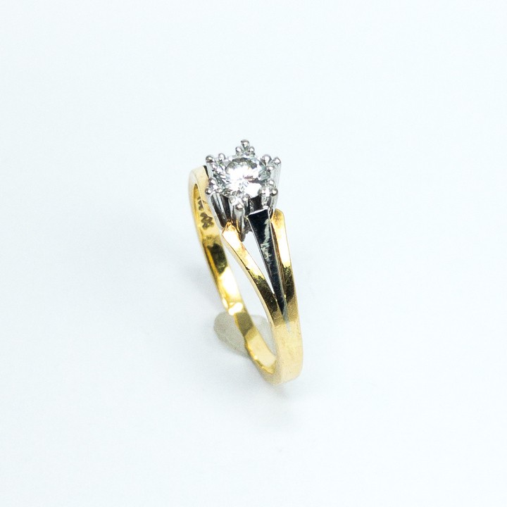Zlatý prsten osazený solitérním přírodním diamantem kulatého briliantového brusu 0,33 ct, velmi dobrá kvalita diamantu, čistota LC - čistý (GIA - IF ) zlato o ryzosti 18 karátů 750/1000 o celkové hmotnosti 3,59 g, velikost prstenu: 55, vhodné jako zásnubní prsten, znalecký posudek o pravosti kamenů přiložen