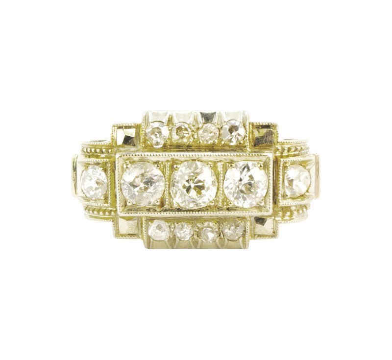 Prsten typický pro období art deco byl zhotoven z bílého (lehounce nažloutlého) zlata ryzosti 585/1000. V široké hlavě jsou zasazeny diamanty briliantového brusu celkové hmotnosti cca 0,55 ct. Velikost prstenu je 55, celková hmotnost 4,88 g.