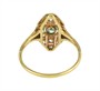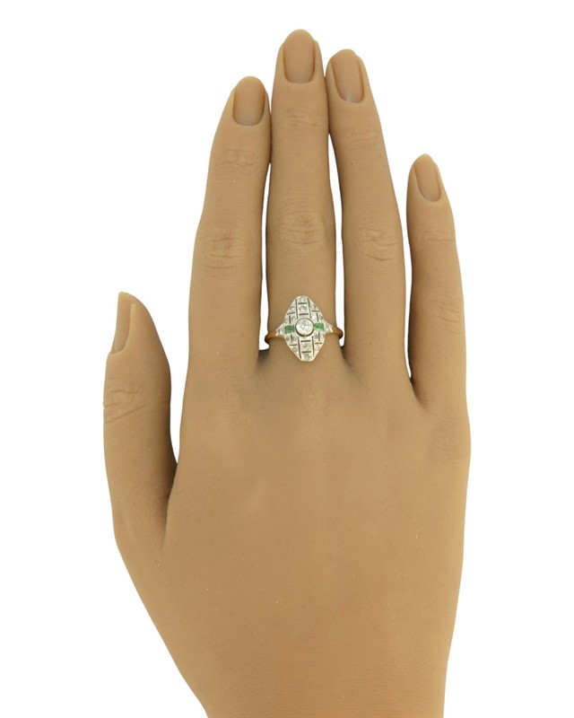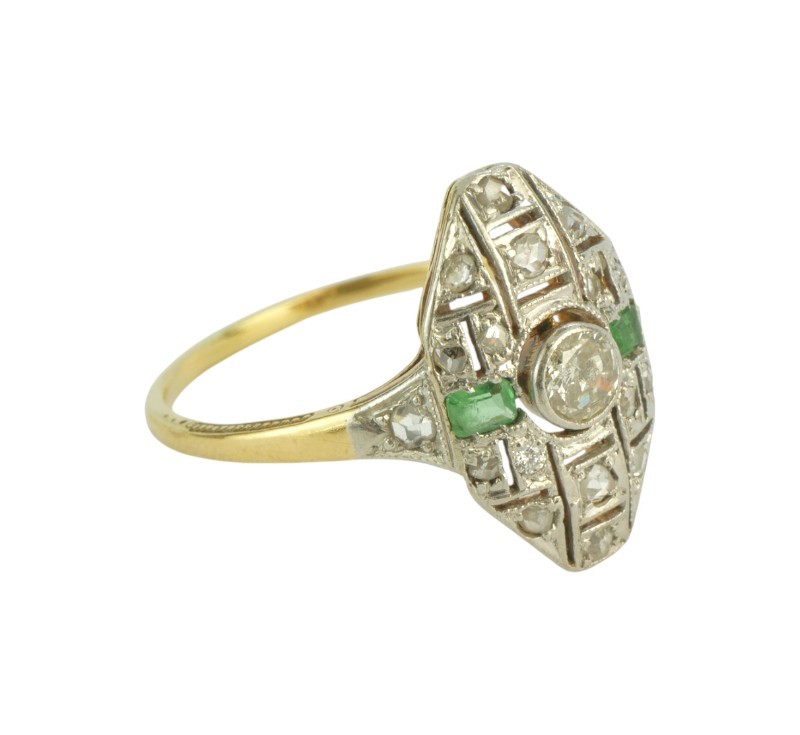 Starožitný zlatý prsten je osazený přírodním diamantem briliantového brusu 0,15 ct a diamantovými routami, zlato o ryzosti 585/1000 o celkové hmotnosti 2,75 g, velikost prstenu 58, rozměry hlavy prstenu: 1,8 x 1,1 cm. Atest Puncovního úřadu.