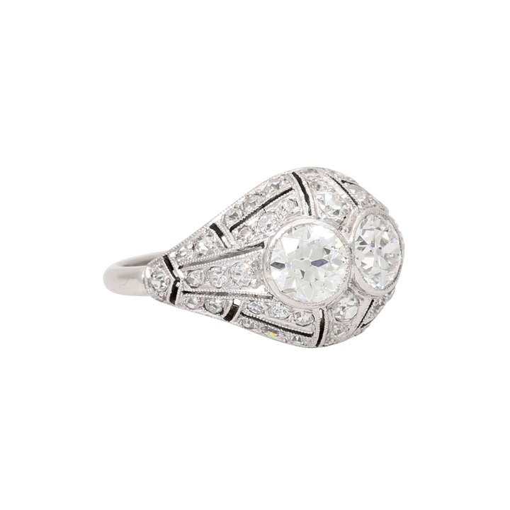 Briliantový prsten 1,45 ct Starožitný platinový prsten je osazený dvěma solitérními diamanty starého briliantového brusu 0,98 ct čistoty VS2 a barvy RW (vzácně bílá ) a W (bílá ) a dalšími brilianty o hmotnosti 0,47 ct velmi dobré kvality 20. léta 20. století, období Art Deco, platina o ryzosti 950/1000 o celkové hmotnosti 3,85 ct, velikost prstenu 50 ( velikost lze na přání upravit ) Atest Puncovního úřadu, Znalecký posudek o pravosti kamenů přiložen