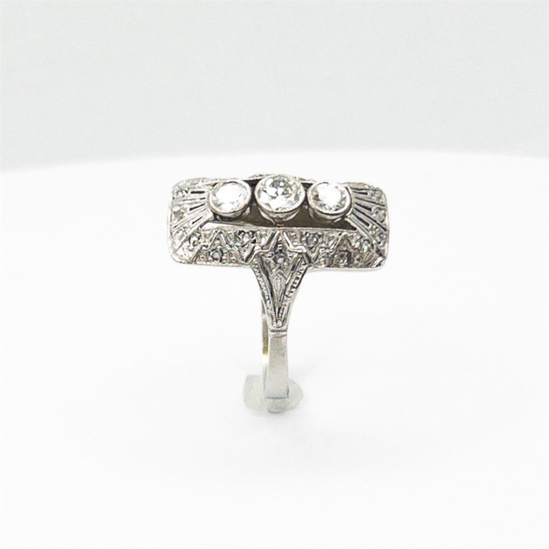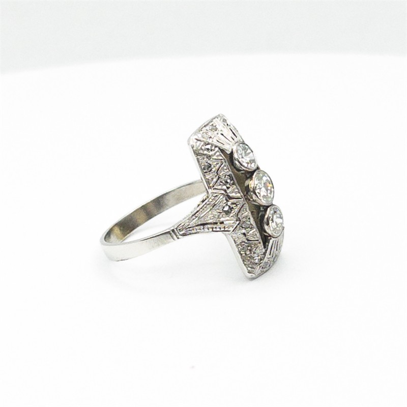 Výrazný starožitný zlatý prsten je osazen třemi přírodními diamanty starého briliantového brusu 0,55 ct, 20. léta 20. století, období Art Deco bílé zlato o ryzosti 14 karátů 585/1000 o celkové hmotnosti 4,66 g, velikost prstenu: 55, rozměry hlavy prstenu: 2 x 1 cm, Atest Puncovního úřadu