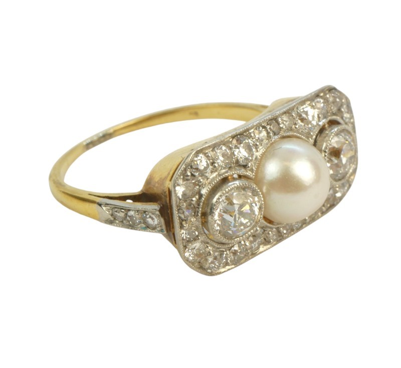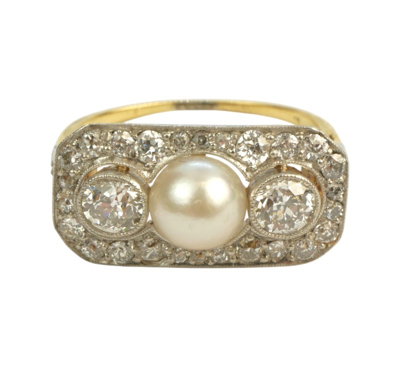 Briliantový prsten s jihomořskou perlou, 20. léta 20. století, období Art Deco, prsten je osazen jednou jihomořskou perlou a přírodními diamanty starého briliantového brusu o celkové hmotnosti 1,28 ct dobré kvality VV-SI, kameny jsou zasazeny v platině, zlato o ryzosti 18 karátů 750/1000/3,95 g, velikost prstenu 52.