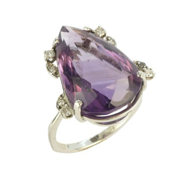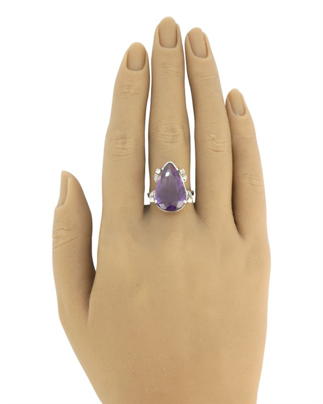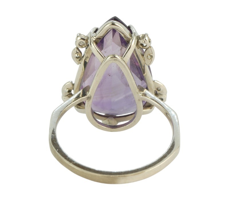 Zlatý prsten s přírodním ametystem 12 ct a brilianty 0,12 ct, centrální kámen byl ověřen jako přírodní ametyst o váze 12 karátů, kapkového portugalského brusu. Au 350/1000 o celkové hmotnosti 5,40 g. Velikost prstenu 56, rozměry hlavy prstenu 2 x 1,5 cm.