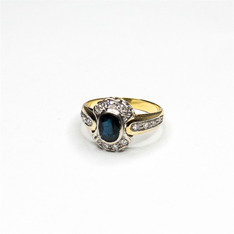 Zlatý prsten osazený safírem a přírodními brilianty oktagonového brusu 0,32 ct, zlato o ryzosti 18 karátů 750/1000 o celkové hmotnosti 3,60 g, velikost prstenu 52 Atest Puncovního úřadu