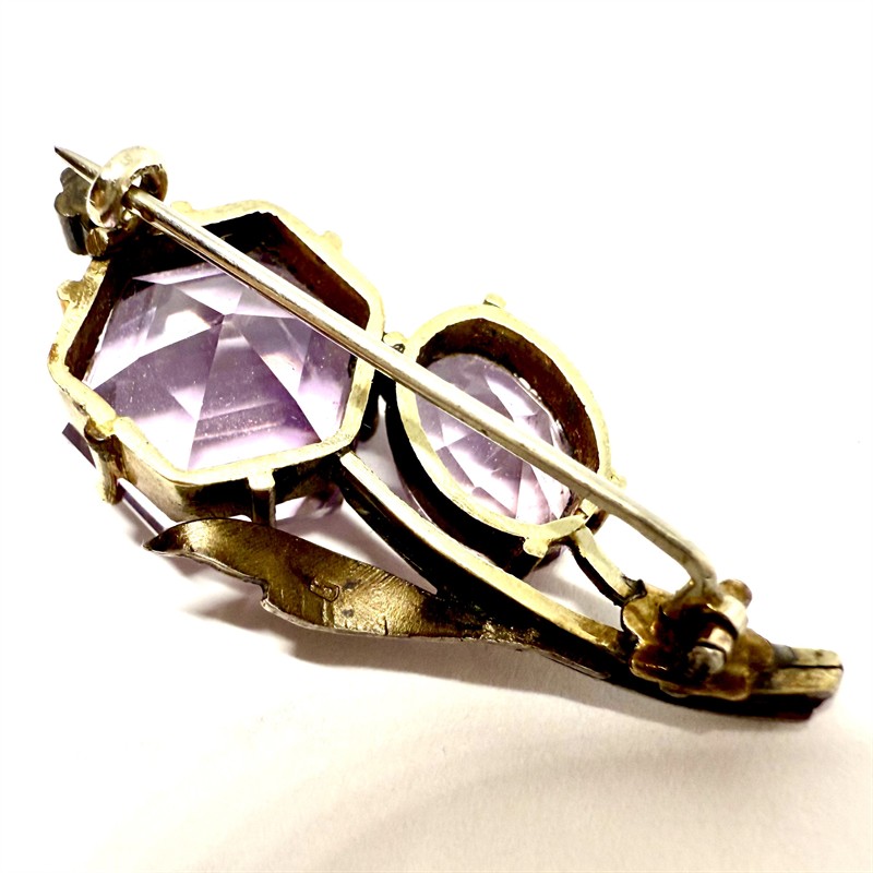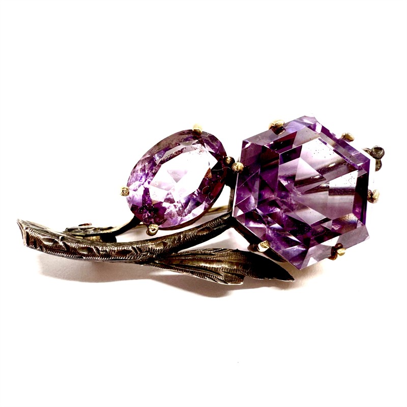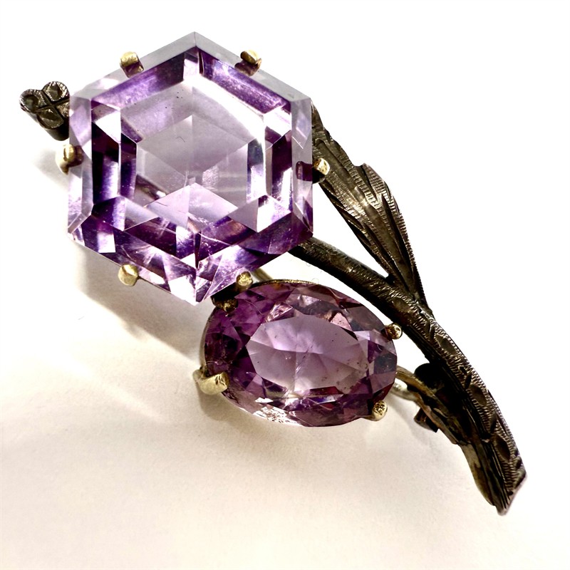 Půvabná, velmi stará brož - větévka. Dominantou šperku jsou dva ametysty, sytého fialového odstínu. Šperk byl vyroben koncem 19. století z obecného kovu a mimo překrásných ametystů je zdobena stříbrem s ručním rytím. Rozměry cca 4 x 1,5 cm. Perfektní stav.