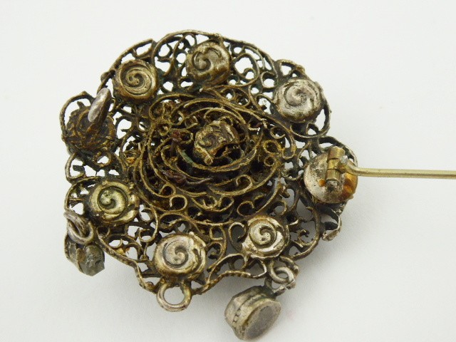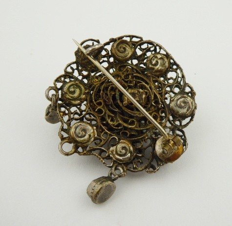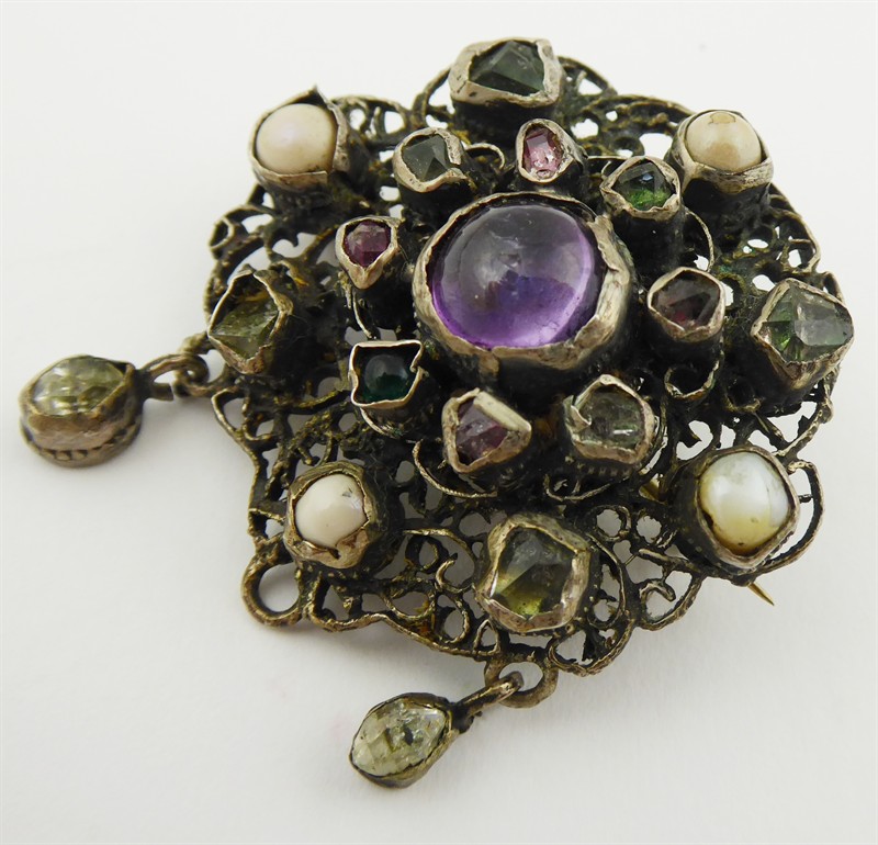 Stříbro, přírodní ametysty, přírodní topazy, přírodní beryl, říční perly a křišťál. Celková hmotnost 14,80 g. Stříbrná ručně prořezávaná brož kulatého tvaru s centrálním větším přírodním ametystem. Menší přírodní ametysty spolu s přírodním berylem a přírodními topazy i říčními perlami jsou zasazeny ve dvou souměrných kruzích. Dva ověsky v dolní části brože jsou v podobě kapek z křišťálu. Velmi kvalitní ruční řemeslná práce mistra klenotníka. Značeno: rakousko-uherský vídeňský punc a nezřetelná mistrovská značka. Rakousko-Uhersko, Vídeň 1866 - 1890. Průměr brože 40 mm.
