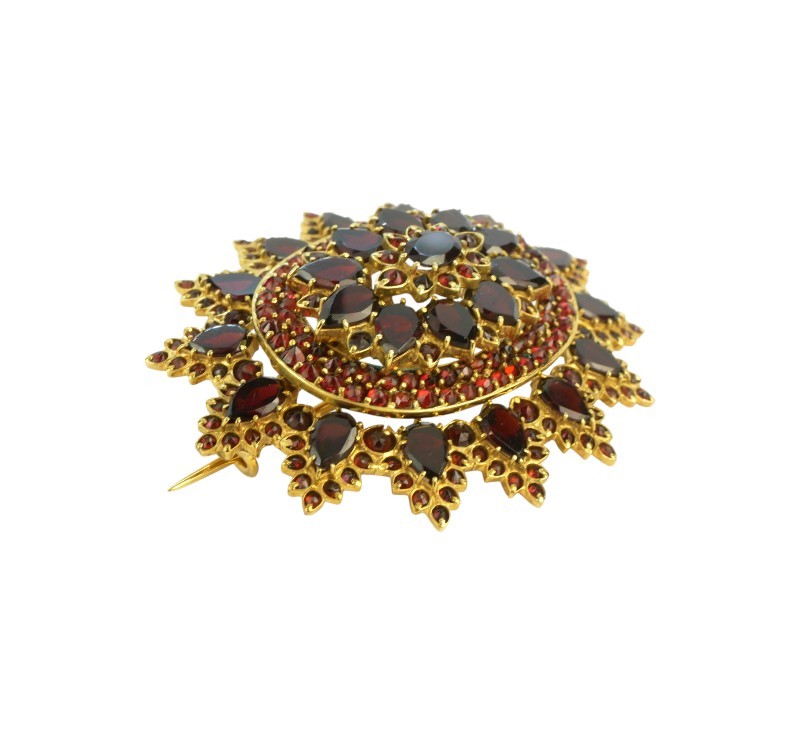 Brož z tombaku má tvar květu. Je oválná, průměr na šířlu je 4,5 cm, na výšku je průměr 4 cm. Je stupňovitá, má 4 úrovně granátů. Jsou zde použité velké české granáty o průměru 5mm. Velkých je 25ks. Kolem je 200 malých drobných českých granátů o průměru 2 mm. Tombak je speciální materiál do kterého se v 19. století vsazovaly české granáty. Brož je zlacená.Žádný granát nechybí, je v perfektním stavu.
