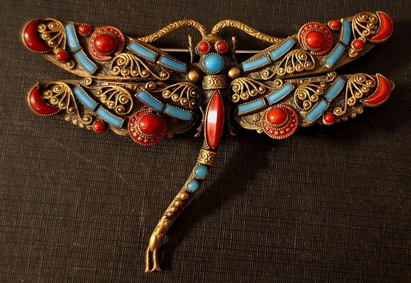 Brož vážka , rozměr 8,2 x 5,6cm, hmotnost 20 g, modré a rudé kameny, tombak, art deco 20. léta m.s.