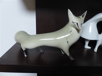 100% bez otluků, prasklin a lepení, stav podle fotek 14 x 23 x 10 cm Tuto figurku lišky vytvořil na počátku šedesátých let Jiří Černoch. Autor pracoval pro porcelánku v Duchcově nejprve externě, od konce padesátých let pak na plný úvazek. Liška je ručně dekorována šedozelenou podglazurní barvou, tahy štětcem jsou dobře znatelné. Zároveň je nadglazurně dekorována tuší. Nejen to, ale i značka Royal Dux napovídá, že figurka vznikla v polovině šedesátých let. Liška je málo obvyklá figurka, takto dekorovaná se vyskytuje ojediněle.