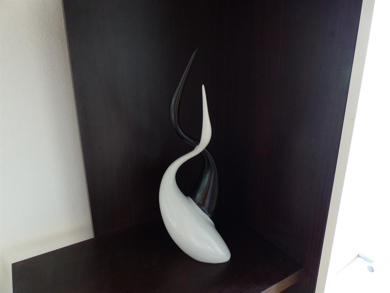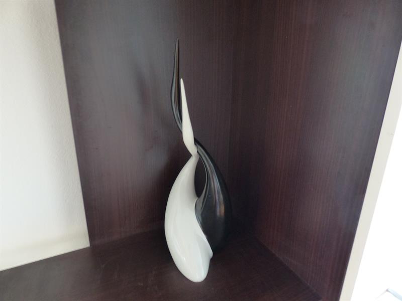 100% bez otluků, prasklin a lepení, stav podle fotek 37 x 12 x 14 cm Volavky jsou asi nejabstraktnější zvířecí plastikou Jaroslava Ježka. Jde o figurku, která sklidila zasloužený úspěch na XII. Trienále v Miláně roku 1960. Ptáci jsou prosti všech detailů, přesto je snadné je identifikovat. Z plastiky je cítit nejen spirálovitý pohyb, ale i vzájemný cit obou zobrazovaných ptáků. Zajímavé je, že díky rukodělné práci jsou u každé plastiky ptáci vůči sobě v trochu jiné poloze. V tomto případě se jedná o černobílou variantu, která je méně obvyklá, než bílá varianta. Podle značky, se dá předpokládat, že tato plastika vznikla v šedesátých letech.