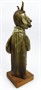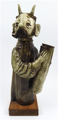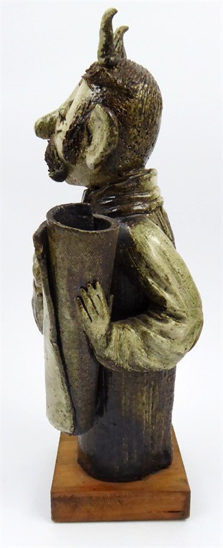 Umělecká keramika. Ve stylu Jana Kutálka. Nesignováno. Vyšší figura čerta z umělecké keramiky držícího v ruce soupis hříchů pozemšťanů. Na dřevěném nízkém podstavci čtvercového tvaru. Československo 1960 - 1990. Výška bez dřevěného podstavce 32 cm, s podstavcem 36 cm.