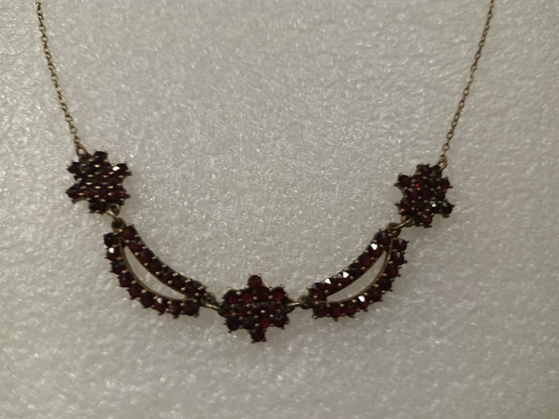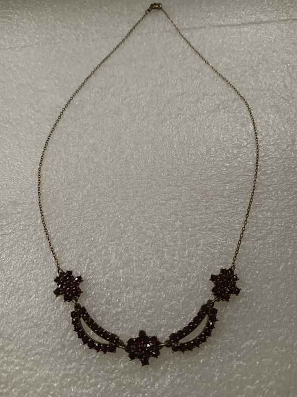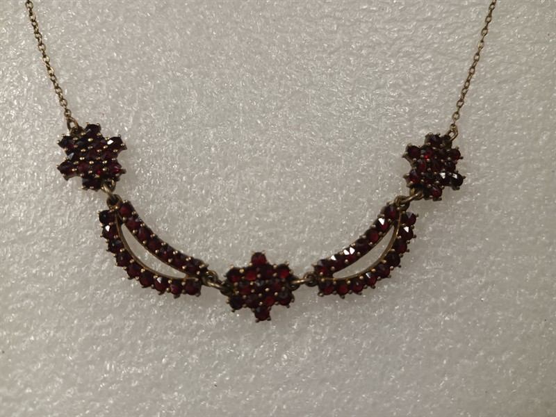 Náhrdelník s českými granáty , zlacené stříbro ryzosti 800/1000 . Délka 45 cm . Hmotnost 7,75 gr